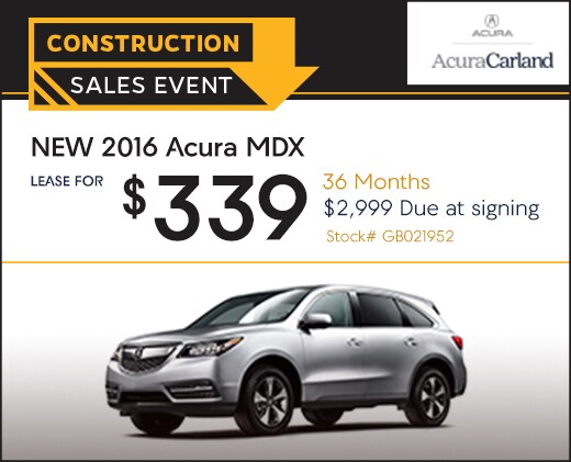 Lease a new 2016 Acura MDX for $339 per month for 36 months. $2,999 due at signing**. This luxury SUV would look great in your driveway. It comes standard with performance braking, USB/iPod integration and key remote functions.